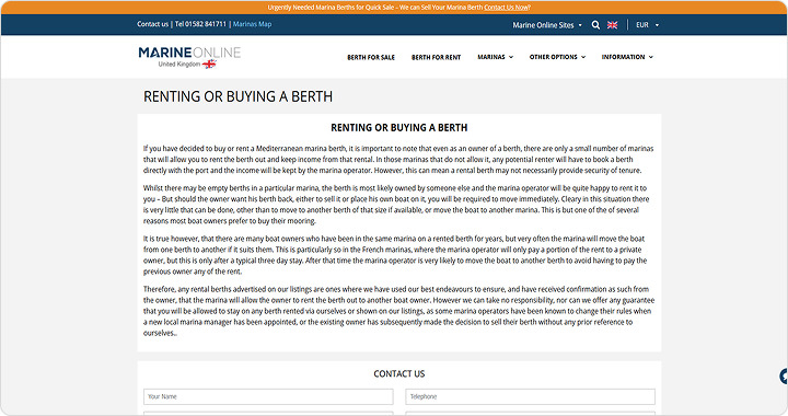 Marine Online is a long-established (since 1985) marina berth brokerage platform offering comprehensive listings and brokerage services throughout the Mediterranean, backed by personalized support, valuation tools, and accessible contact options.